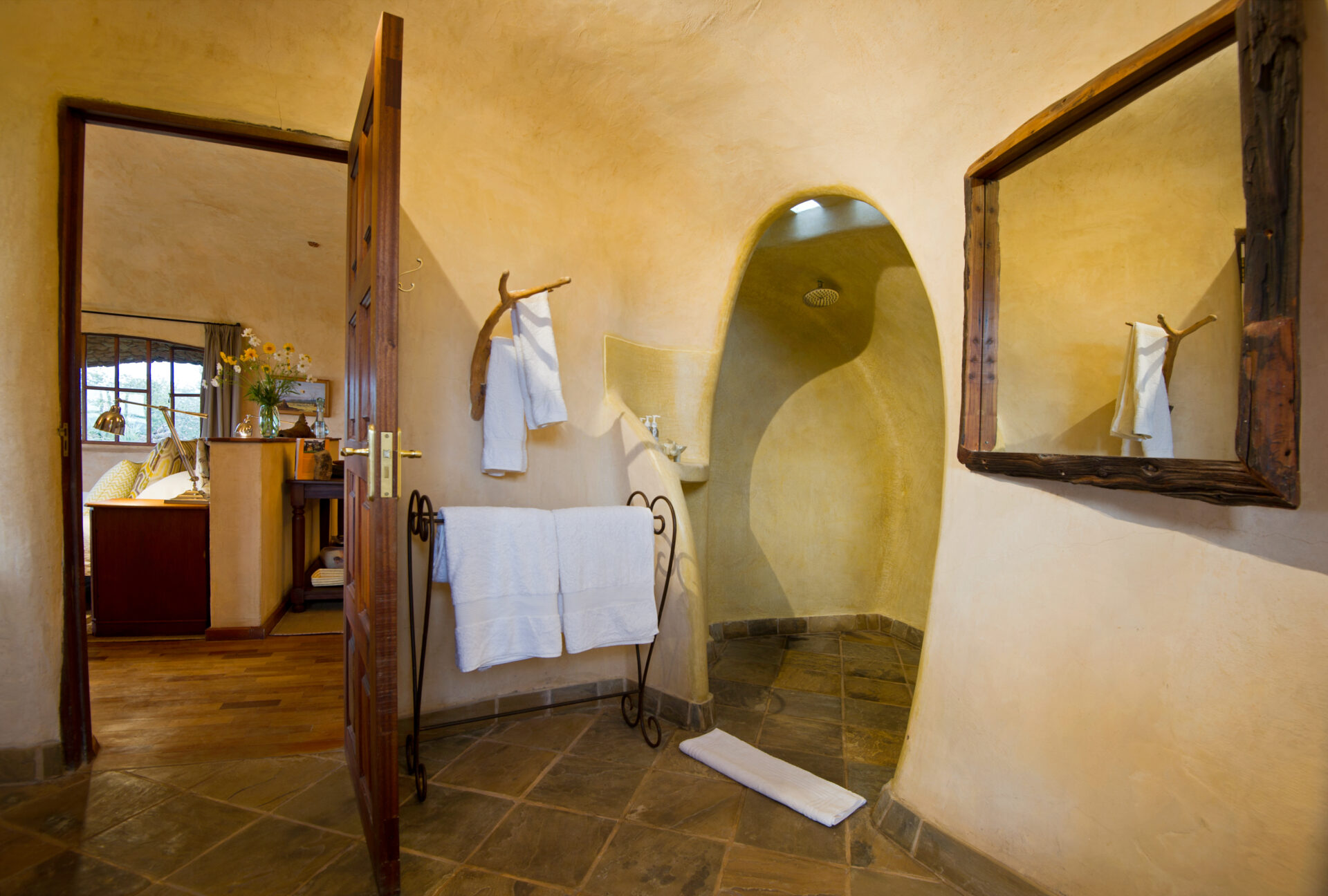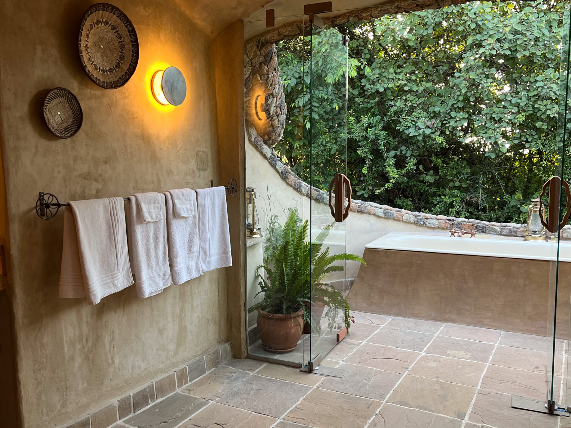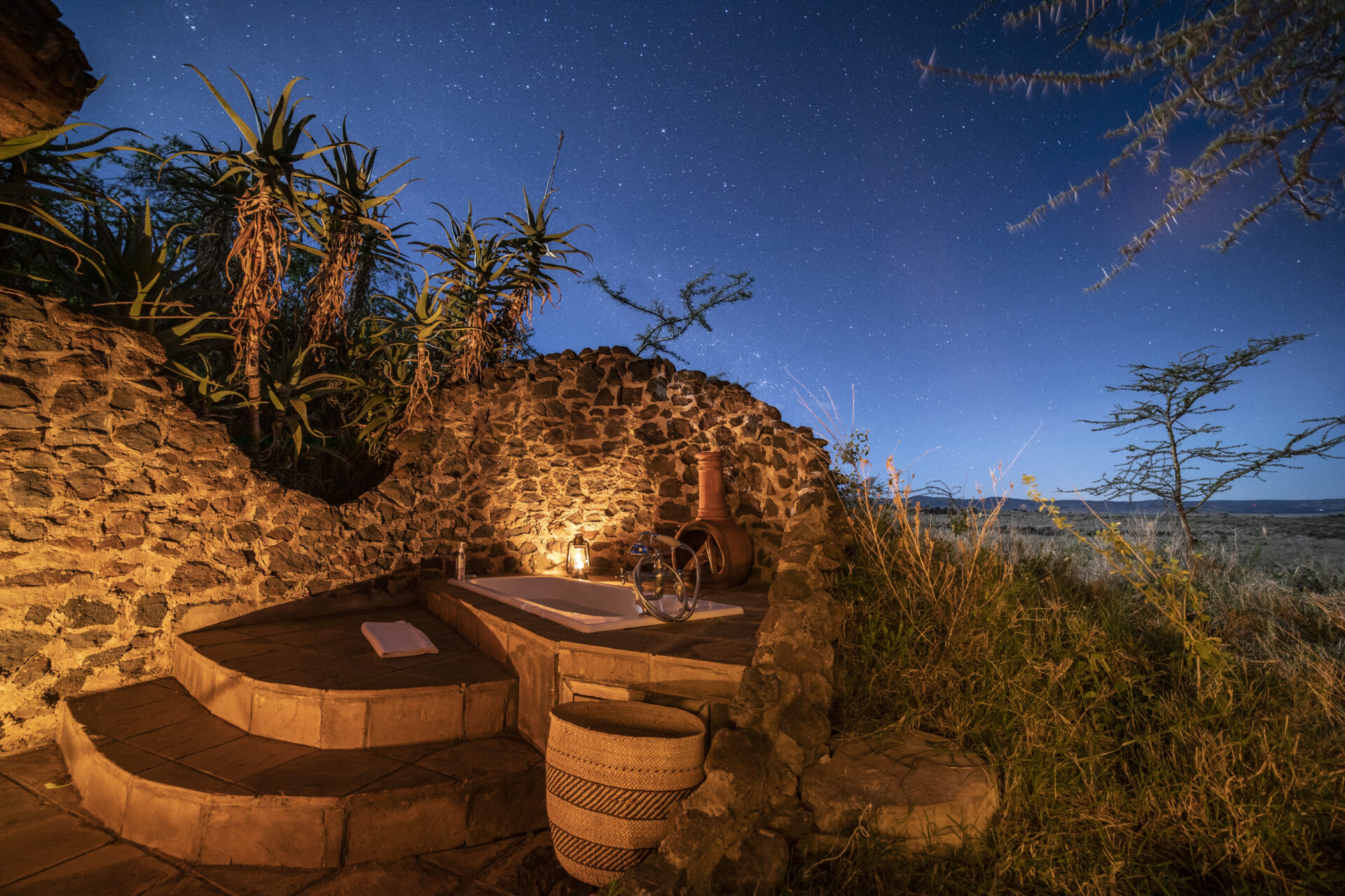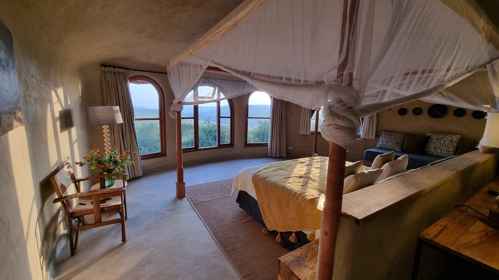 The Earthpods, designed by Sophie’s father, were built to blend into the landscape and their curved walls create a comfortable atmosphere inside. They can be configured as either a twin or a double room given their spacious nature. The inside bathroom has a shower and bath and three of the Earthpods have an outdoor bath that allows you to bathe under the African sky and lose track of time.