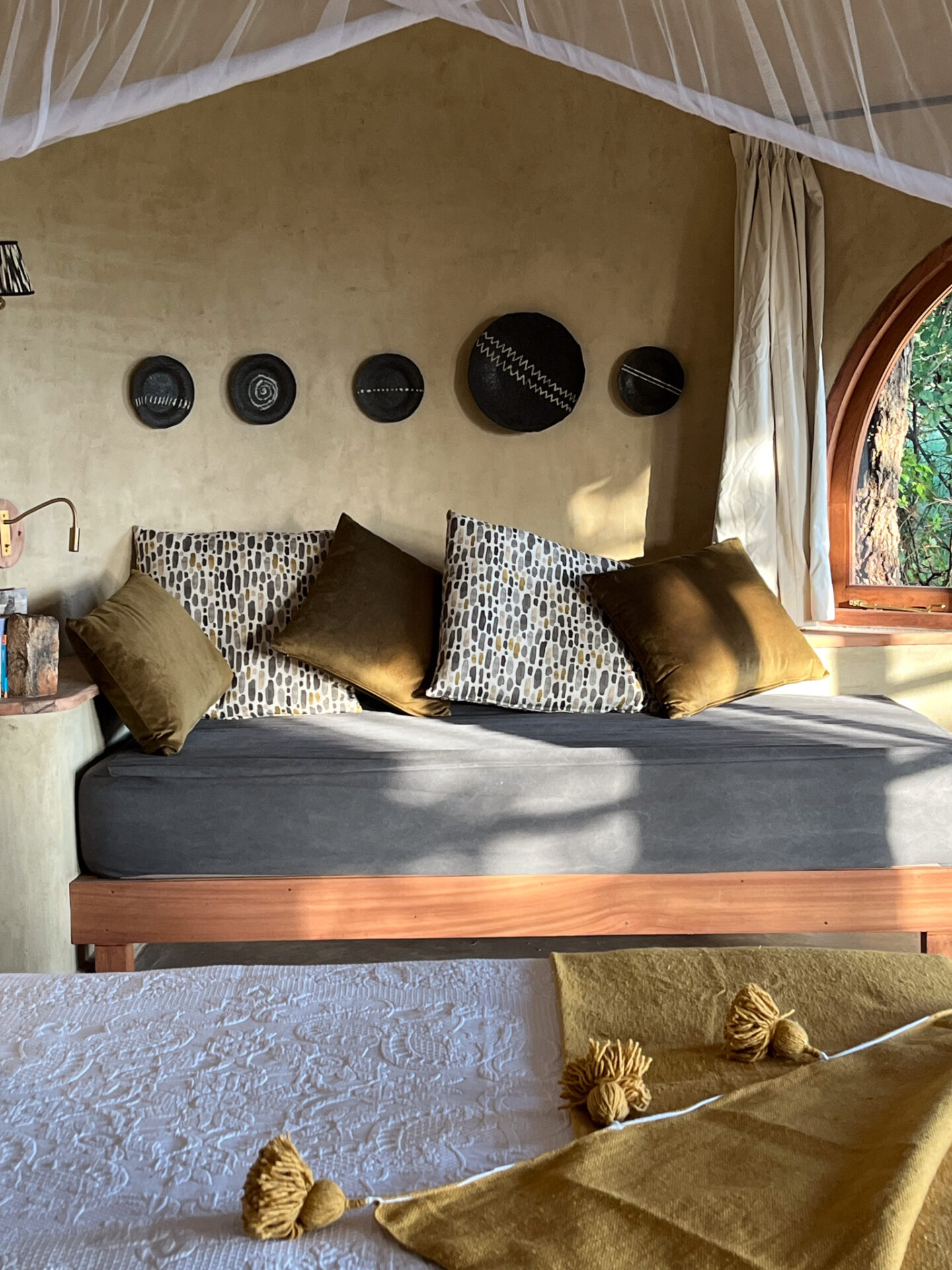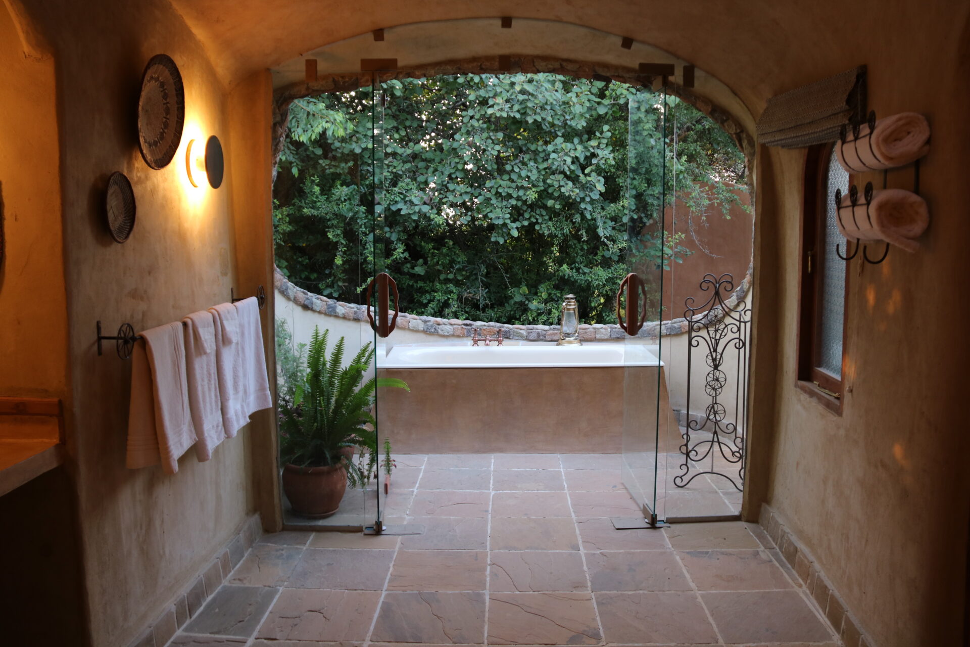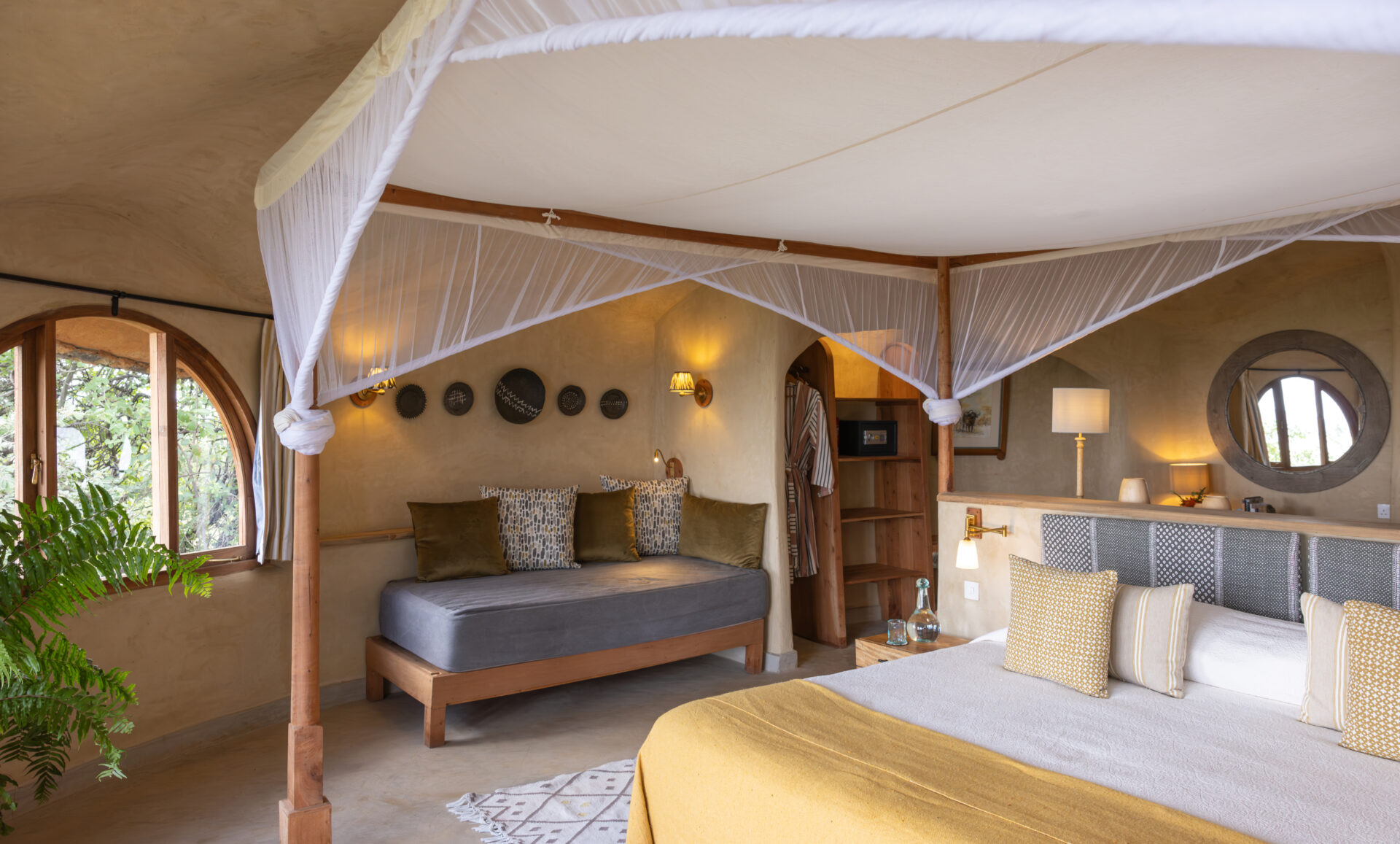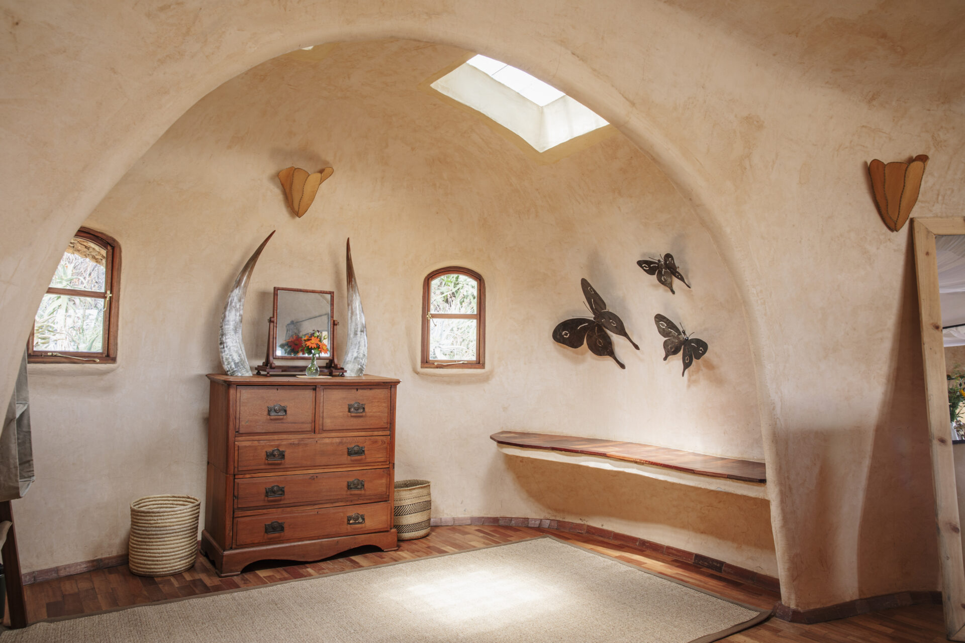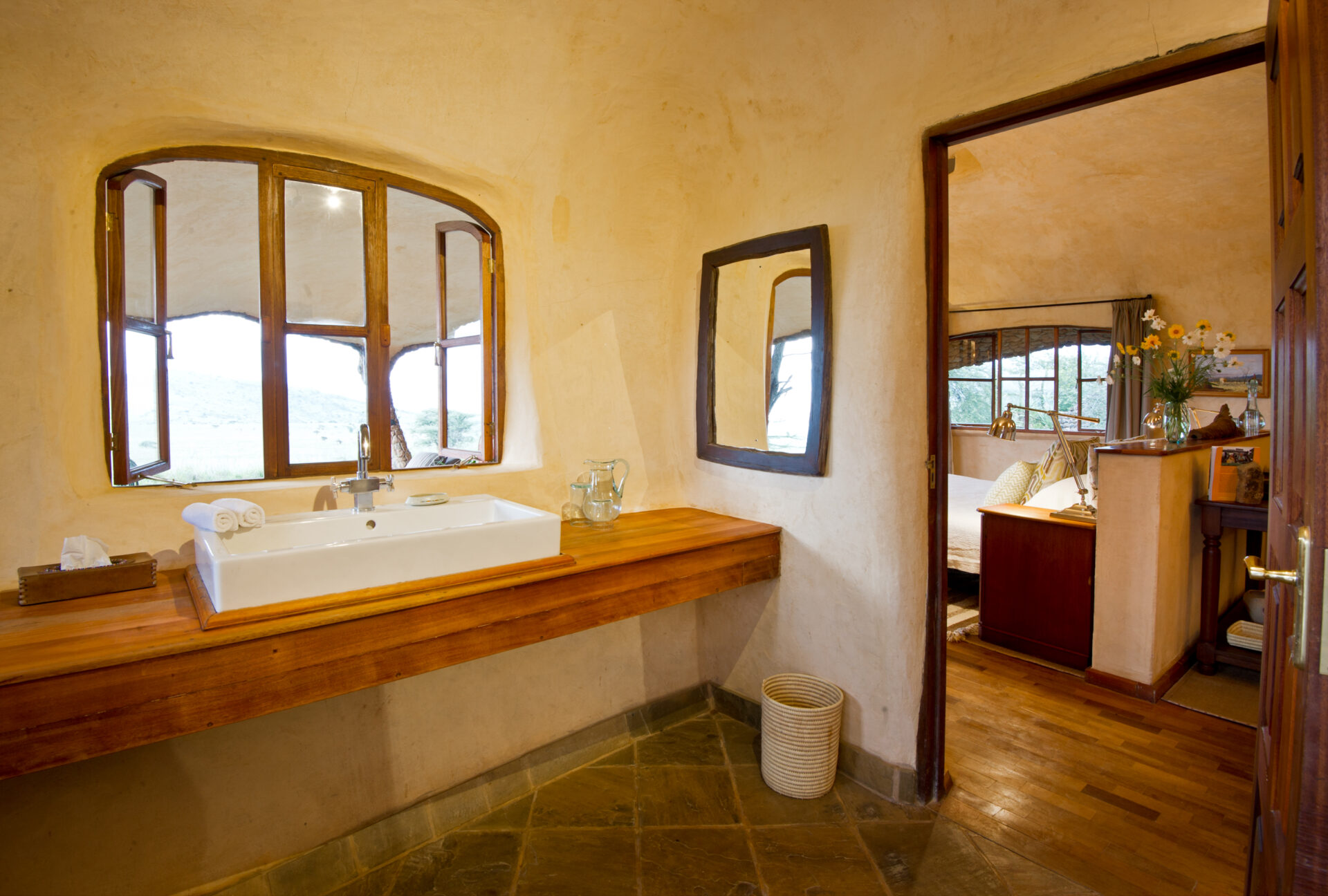 The Earthpods, designed by Sophie’s father, were built to blend into the landscape and their curved walls create a comfortable atmosphere inside. They can be configured as either a twin or a double room given their spacious nature. The inside bathroom has a shower and bath and three of the Earthpods have an outdoor bath that allows you to bathe under the African sky and lose track of time.