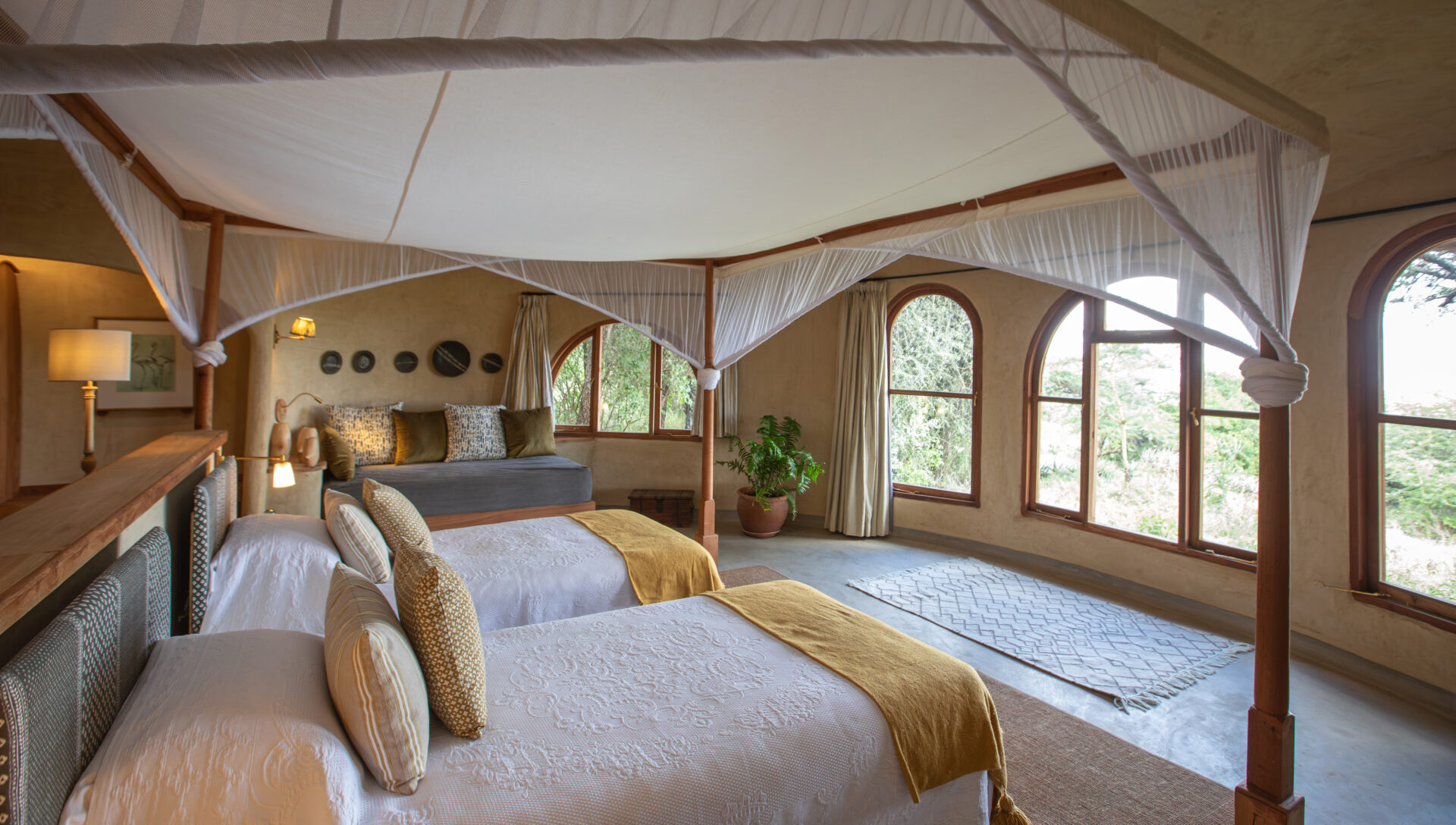 Recently renovated from the original family cottages that were built in the traditional Lewa style with rough stone walls and thatched roofs, the new Family Pods now feature the same loved design of the individual Earthpods. Each cottage has two bedrooms, designed to be a twin or a double, connected by a sitting room with sweeping views over the landscape.