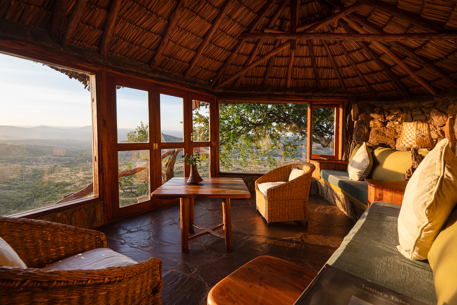 - Stone and thatch design built into the escarpment with stunning views